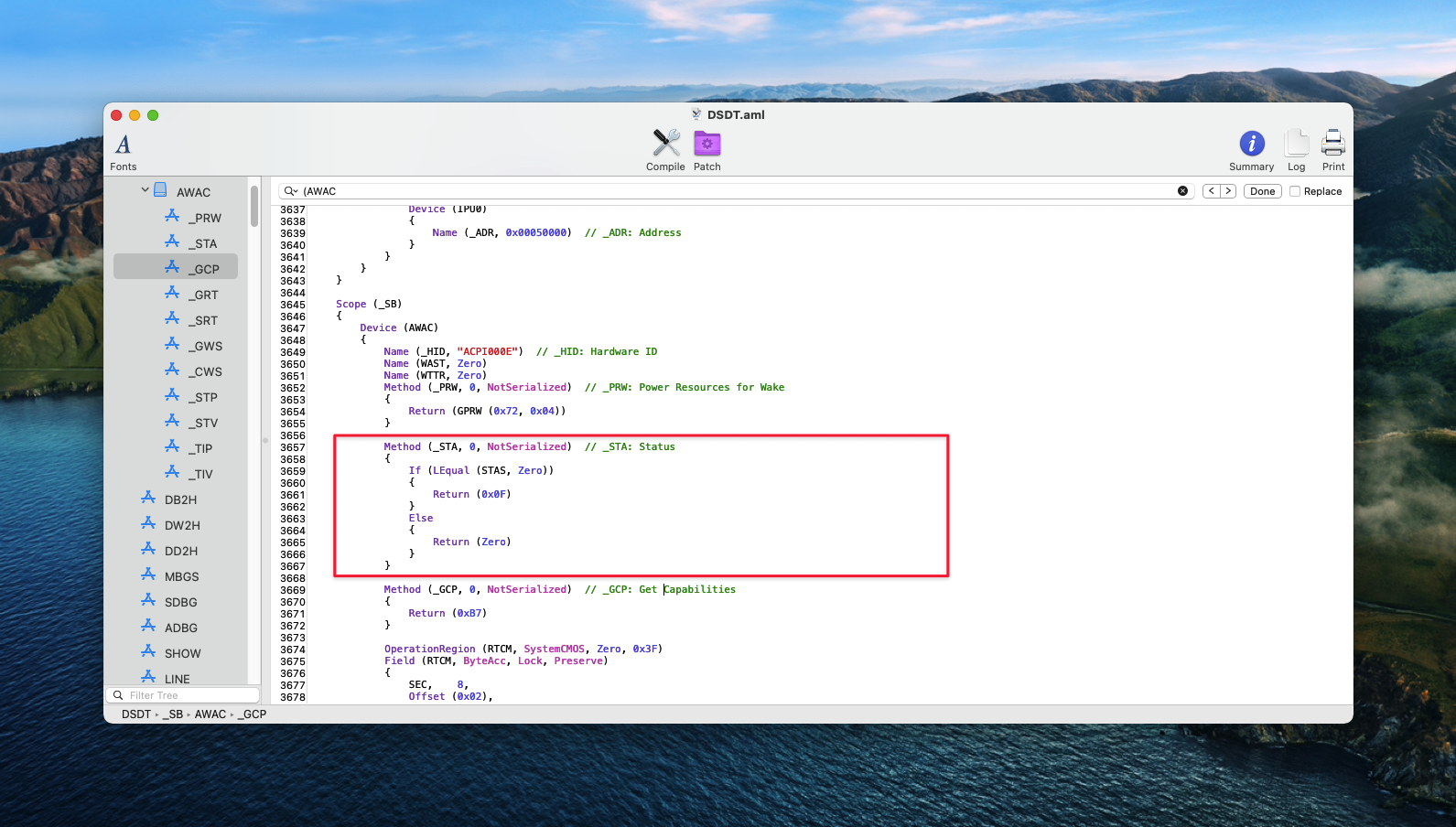 Method(_STAthể hiện status của device đó ở đây là deviceRTCvàAWACTiếp đó sẽ là câu lệnh if ta sẽ thấy ở
