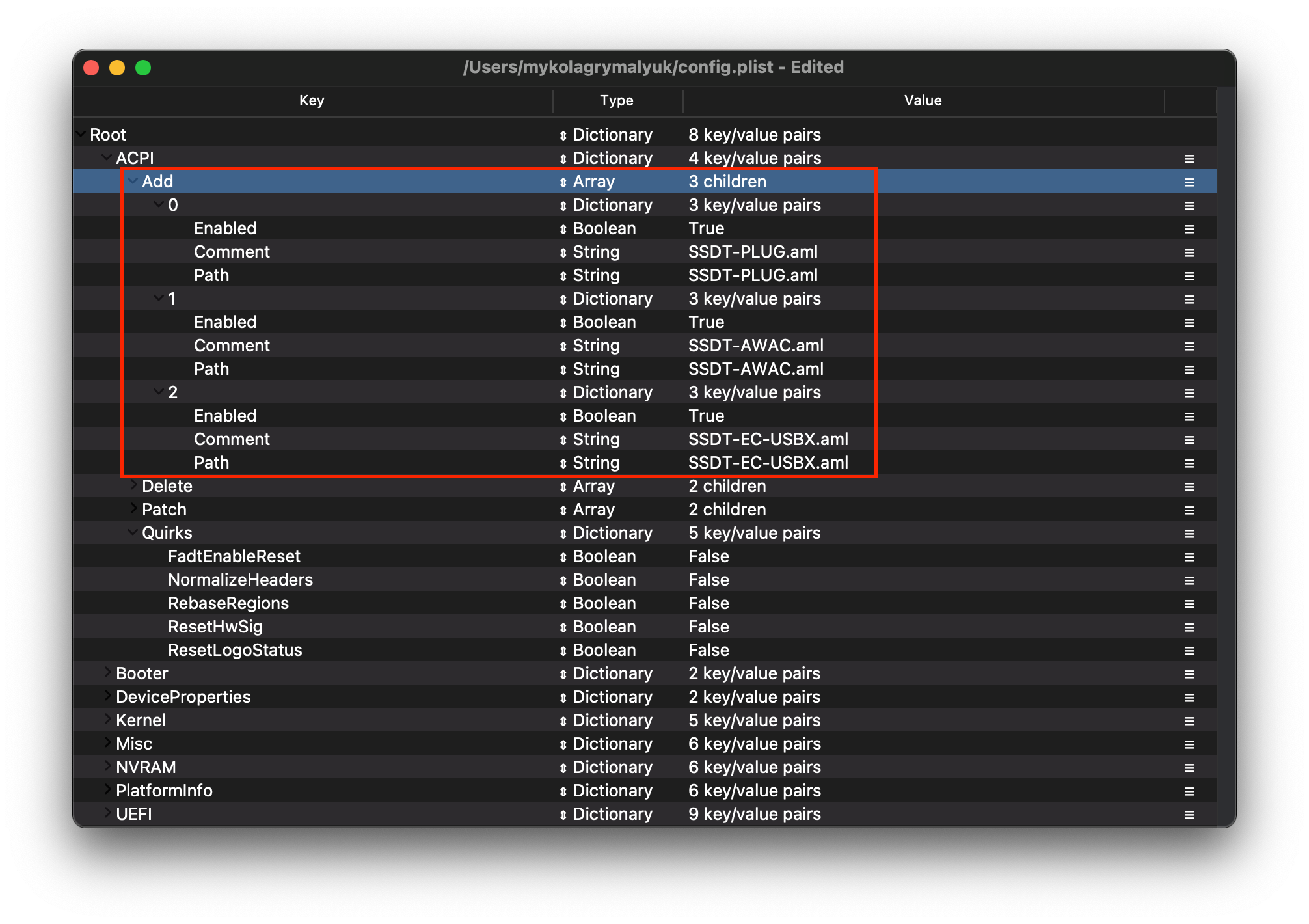 Phần này không cần chỉnh sửa gì, chỉ cần thêm SSDT-EC-USBX, SSDT-PLUG