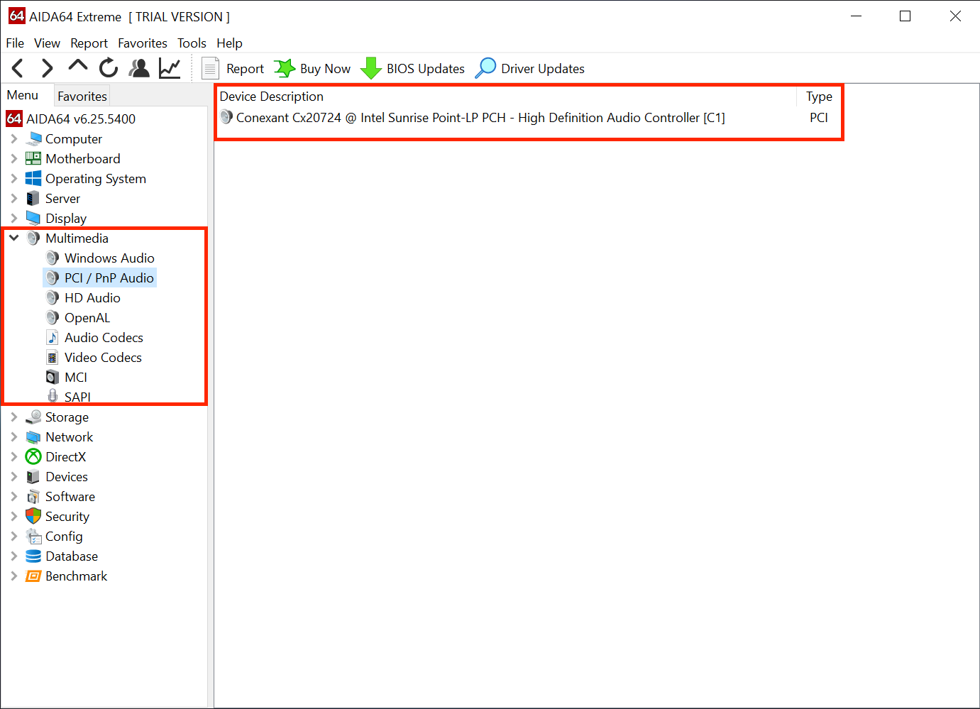 B2: Các bạn sẽ vào tab Multimedia --> PCI/PnP Audio ở đây ta sẽ có thể thấy audio codec.