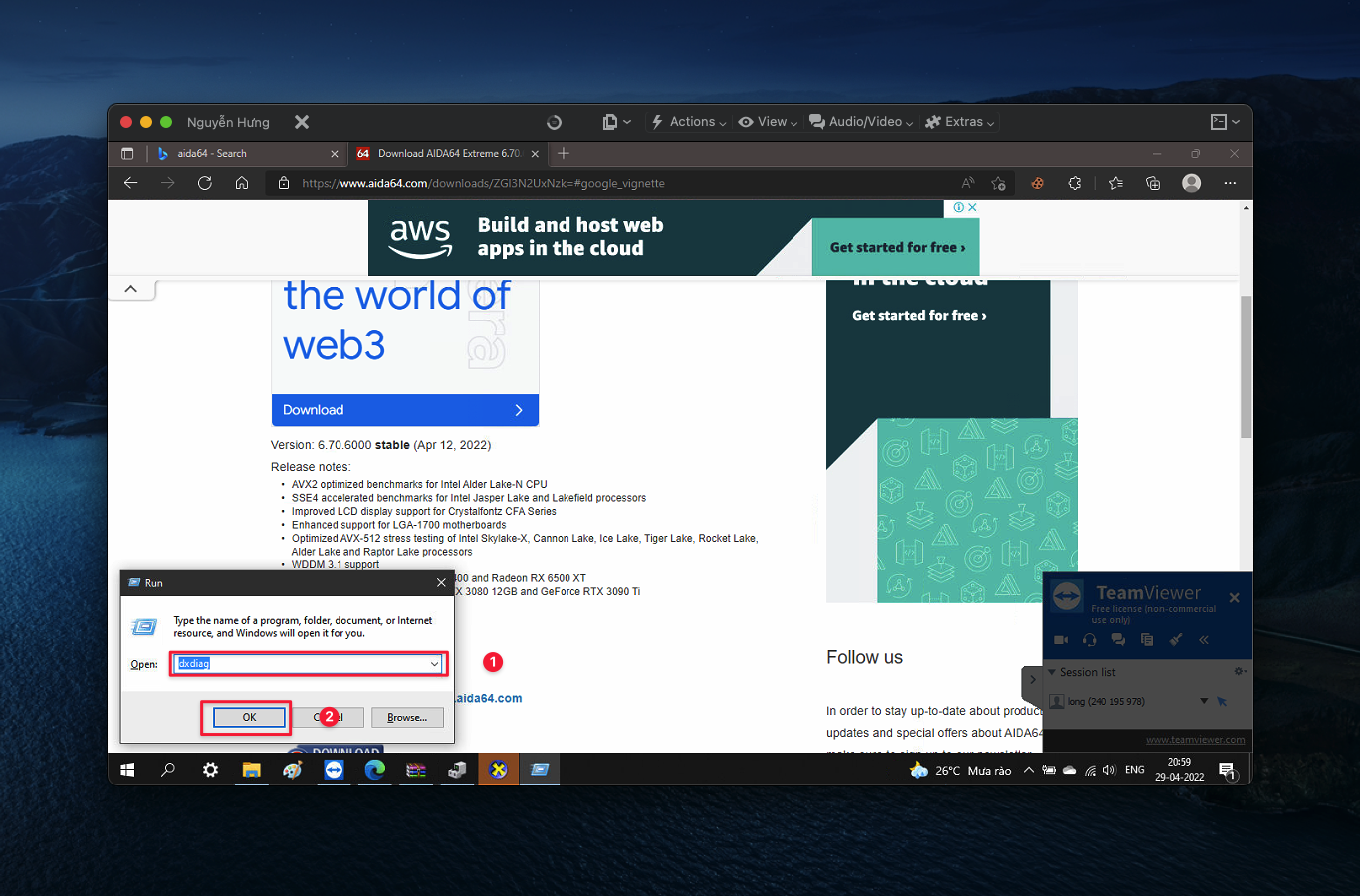 B1: Bạn nhấn tổ hợp phím Windows + R và gõ dxdiag sau đó enter.