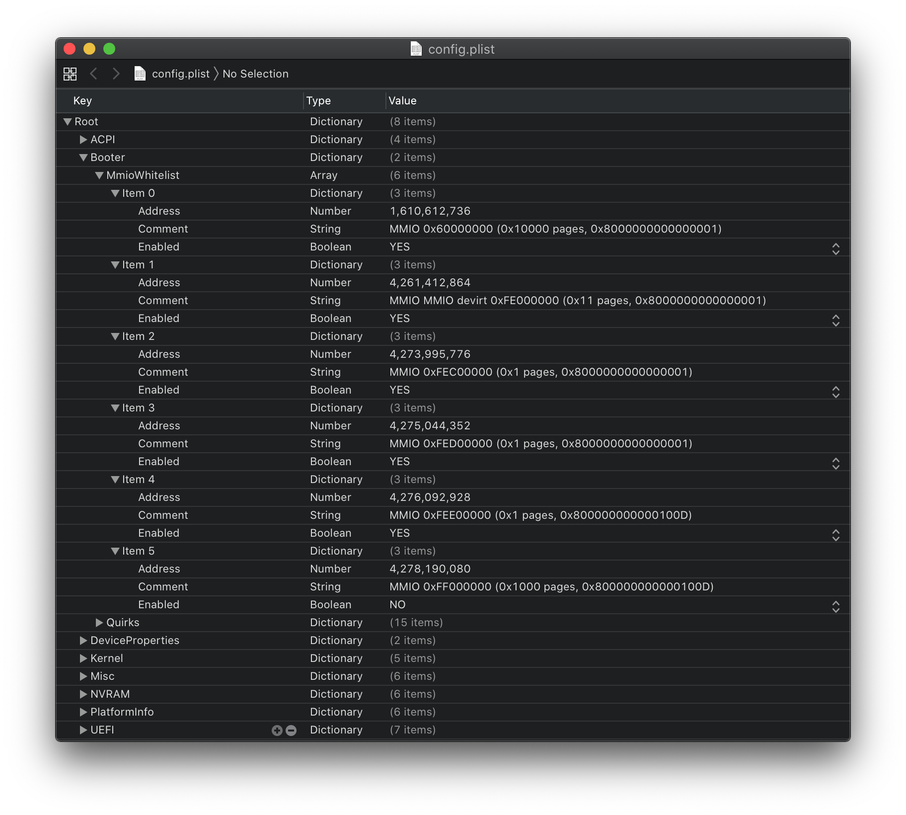 AvoidRuntimeDefrag: YESDevirtualiseMmio: YESEnableSafeModeSlide: YESProtectUefiServices: NOProvideCustomSlide: YESRebuildAppleMemoryMap: YES