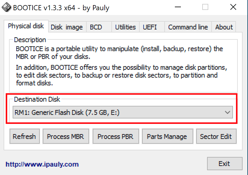 B1: Các bạn mở Bootice lên và chọn đúng ổ đĩa: