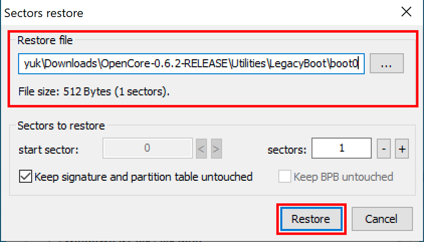 B2: Ấn Process MBR và chọn Restore MBR tiếp theo bạn chọn file boot0 trong Utilities/LegacyBoot/ ở OpenCore PKG.