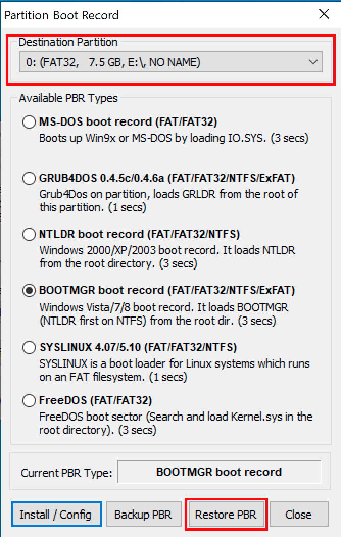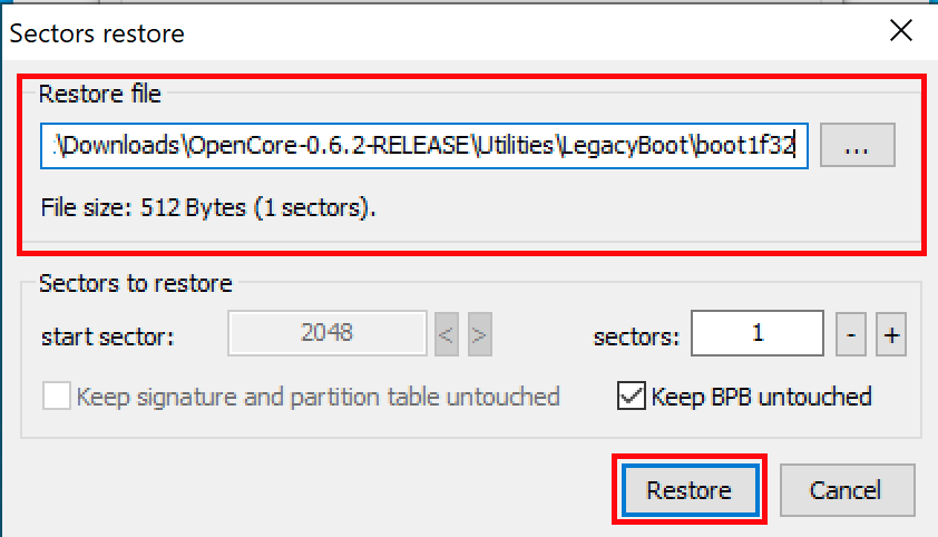 B3: Các bạn trở về menu chính và ấn Process PBR sau đó ấn Restore PBR và chọn file boot1f32 từ Utilities/LegacyBoot/ ở OpenCorePkg